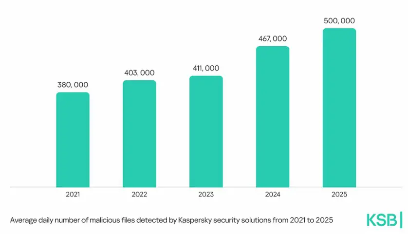 Kaspersky détecte 500 000 malwares quotidiennement en 2025.
