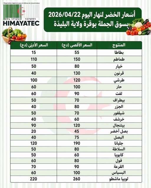 Le moment est à un optimisme mesuré. D’après les dernières données publiées hier soir, le 22 avril 2026, par l’organisation de défense des consommateurs Himayatec, une tendance baissière commence à se dessiner. Les relevés effectués à 21h30 au marché de gros de Bougara, dans la wilaya de Blida, confirment un retour progressif à la normale.
