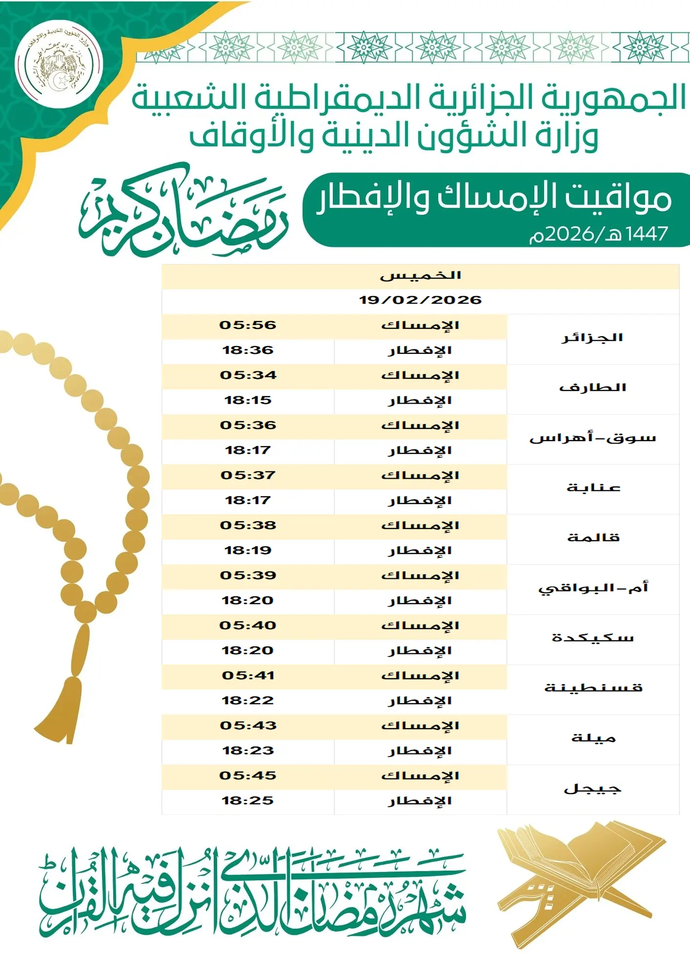 Aujourd’hui, 19 février 2026, les Algériens entament officiellement le mois sacré du Ramadan (1447H). Le Ministère des Affaires Religieuses et des Wakfs a publié hier les horaires de l’imsak et de l’iftar pour ce jeudi, premier jour de jeûne, pour l’ensemble du pays.