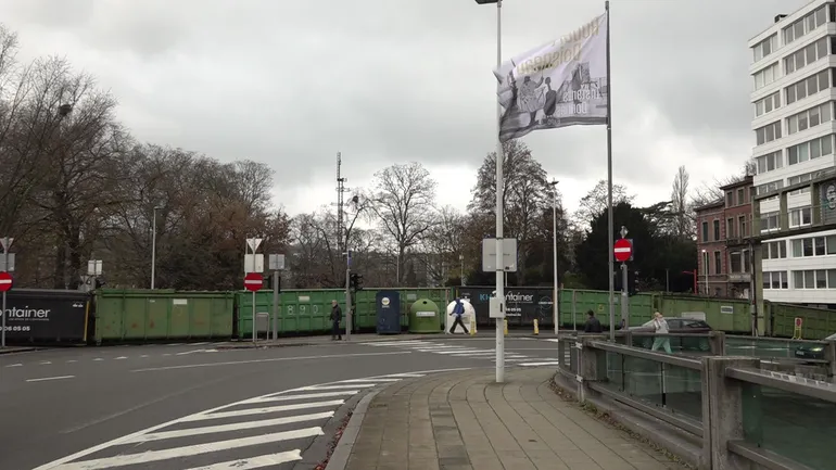 La police renforce son dispositif pour le MR à Liège : banderole des antifas et conteneurs pour fermer la rue.