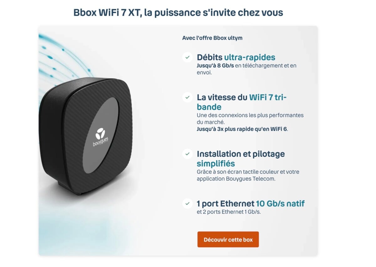 Elle se distingue des autres offres de Bouygues par une intégration du Wi-Fi 7 sur trois bandes et un débit de réception allant jusqu’à 8 Gb/s.