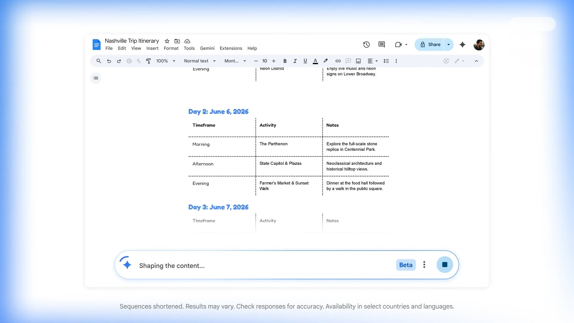 Enfin, si vous trouvez un modèle d’itinéraire de voyage qui vous plaît, Gemini peut le copier et le remplir en quelques instants avec les informations de voyage pertinentes, en s’appuyant sur vos e-mails pour extraire des données telles que les horaires de vol, les réservations d’hôtel ou les détails de location de voiture.