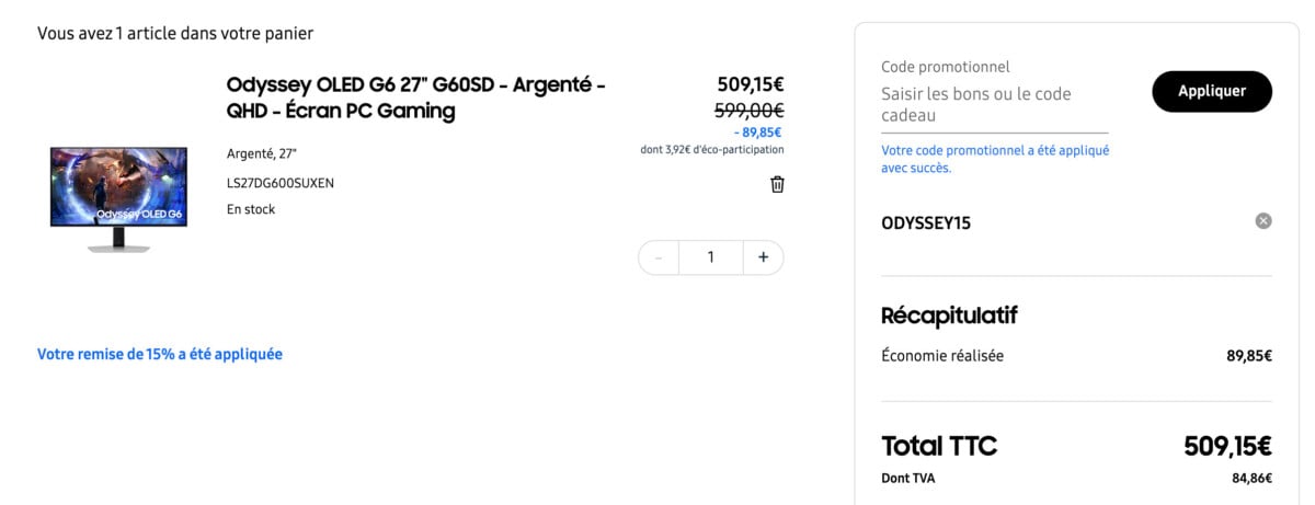 Initialement vendu à 899 euros, actuellement proposé à 599 euros, l’écran PC Samsung Odyssey OLED G6 (G60SD) peut être acquis pour 509,15 euros sur le site de Samsung grâce au code promo ODYSSEY15.