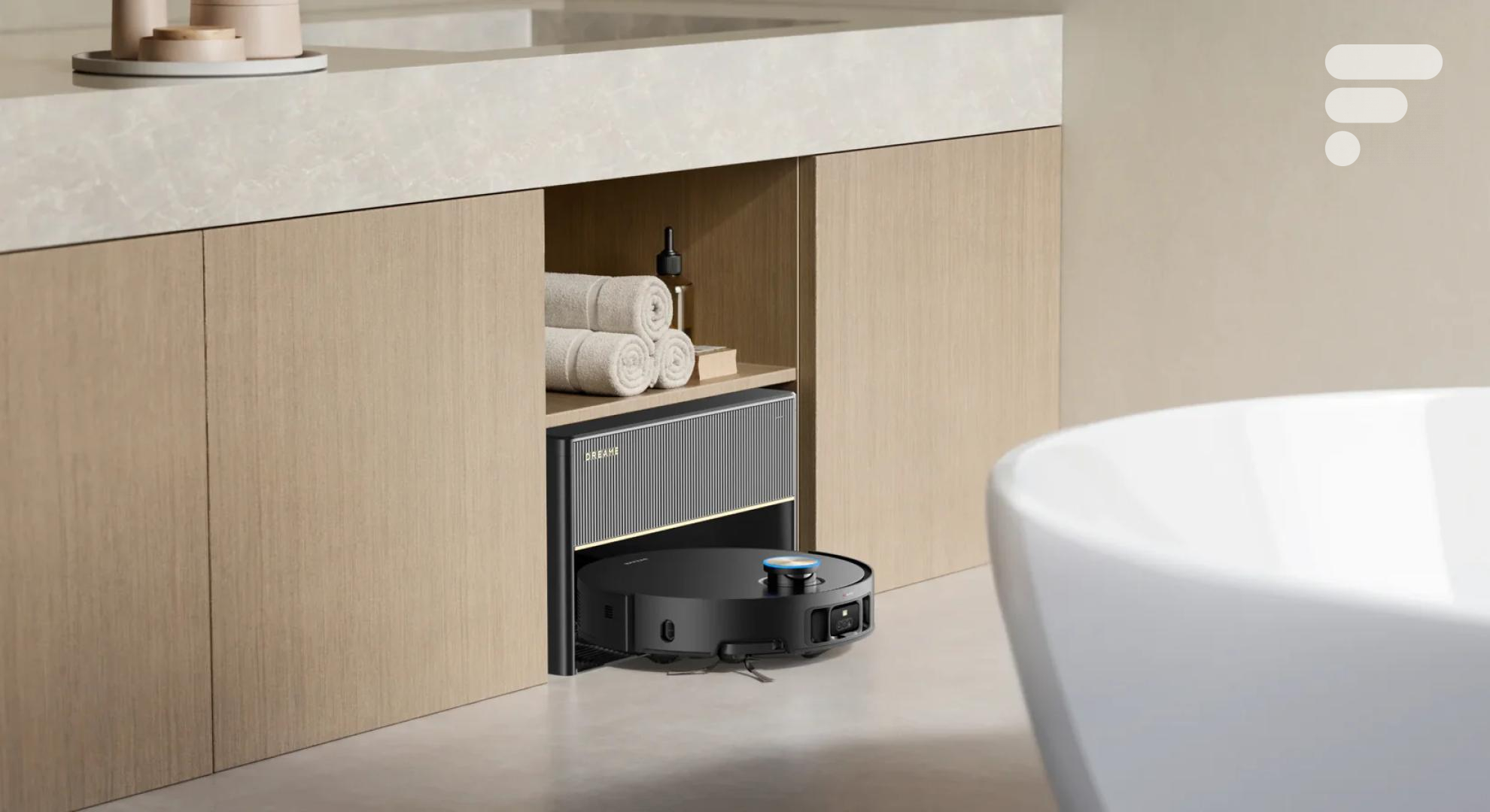 Le robot s’accompagne d’une base 8-en-1, un centre de contrôle compact qui, grâce à son format rectangulaire et à sa taille de 24,9 cm, peut s’intégrer harmonieusement dans un meuble de salon, une cuisine ou même une salle de bain. Cette base remplit plusieurs fonctions : elle remplit automatiquement le réservoir d’eau et de solution nettoyante, nettoie les serpillières à 80°C puis les sèche automatiquement, vide l’eau pendant 100 jours, gère la vidange et recharge le robot. En somme, une base qui simplifie considérablement l’entretien de l’appareil.
