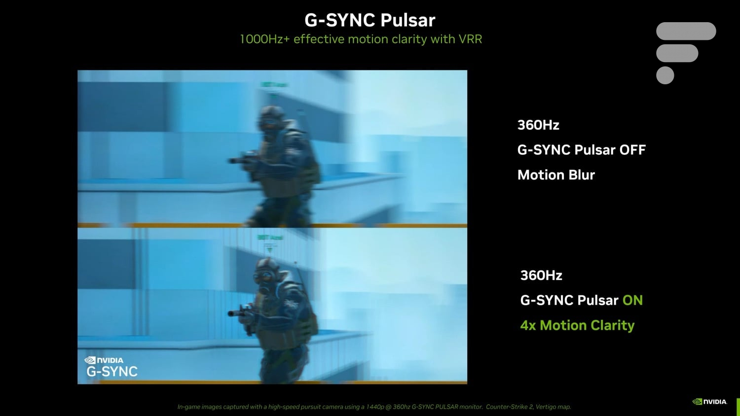 Cette méthode permet aux pixels de se stabiliser avant d’être éclairés. En limitant la pulsation de la lumière à seulement 25 % de la durée d’une image, le G-Sync Pulsar réduit de quatre fois le temps d’affichage des objets à l’écran, offrant ainsi une clarté de mouvement quatre fois supérieure aux normes actuelles.