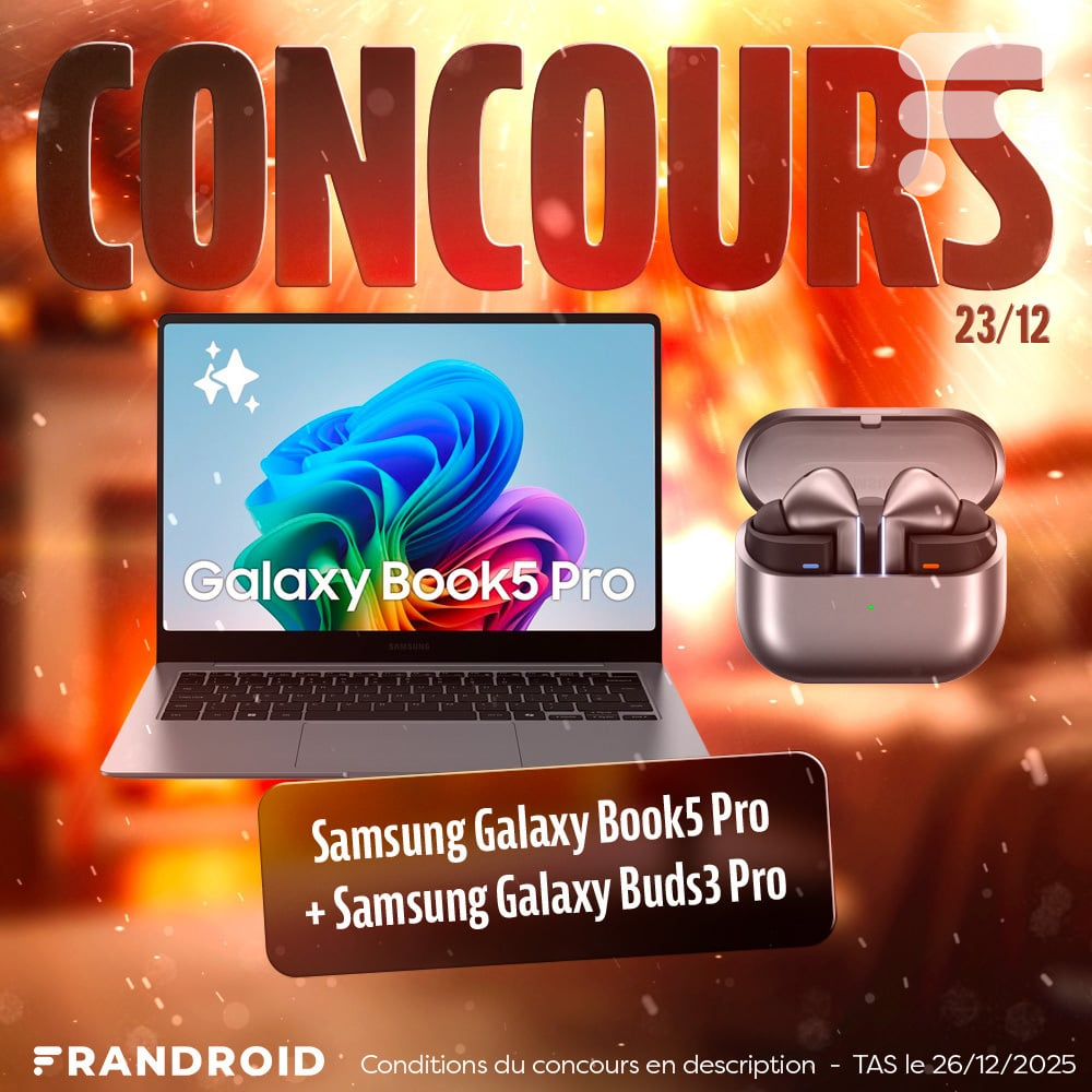 Un pack comprenant un Samsung Galaxy Book 5 Pro et des Samsung Galaxy Buds 3 Pro est proposé dans le cadre du concours #FrandroidOffreMoi. La date du tirage au sort est fixée au 26 décembre.