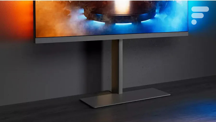 Le Philips 65OLED959 se distingue d’abord par son design minimaliste et moderne, avec un revêtement en tissu élégant. Contrairement à la plupart des concurrents, il est équipé d’un pied haut permettant de poser le téléviseur directement au sol, évitant ainsi d’investir dans un meuble TV. Cependant, il peut également être monté au mur. Un autre de ses atouts de design est son système Ambilight Plus.