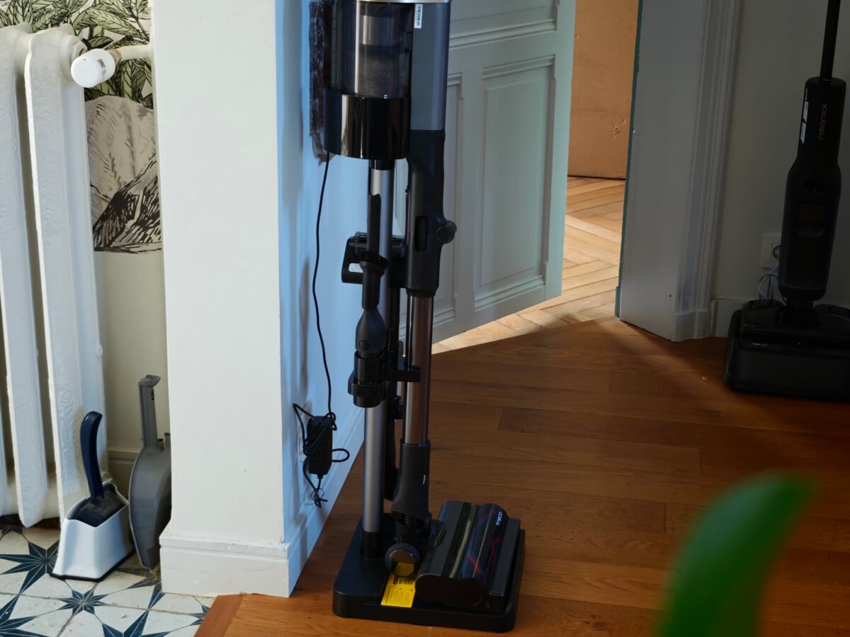 La station de charge garde tous les accessoires à portée de main et rien ne traîne. Enfin, la batterie est amovible, ce qui est un avantage pour sa durabilité. Encore faut-il pouvoir se procurer des batteries dans le commerce pour retrouver des performances optimales avec cet aspirateur.