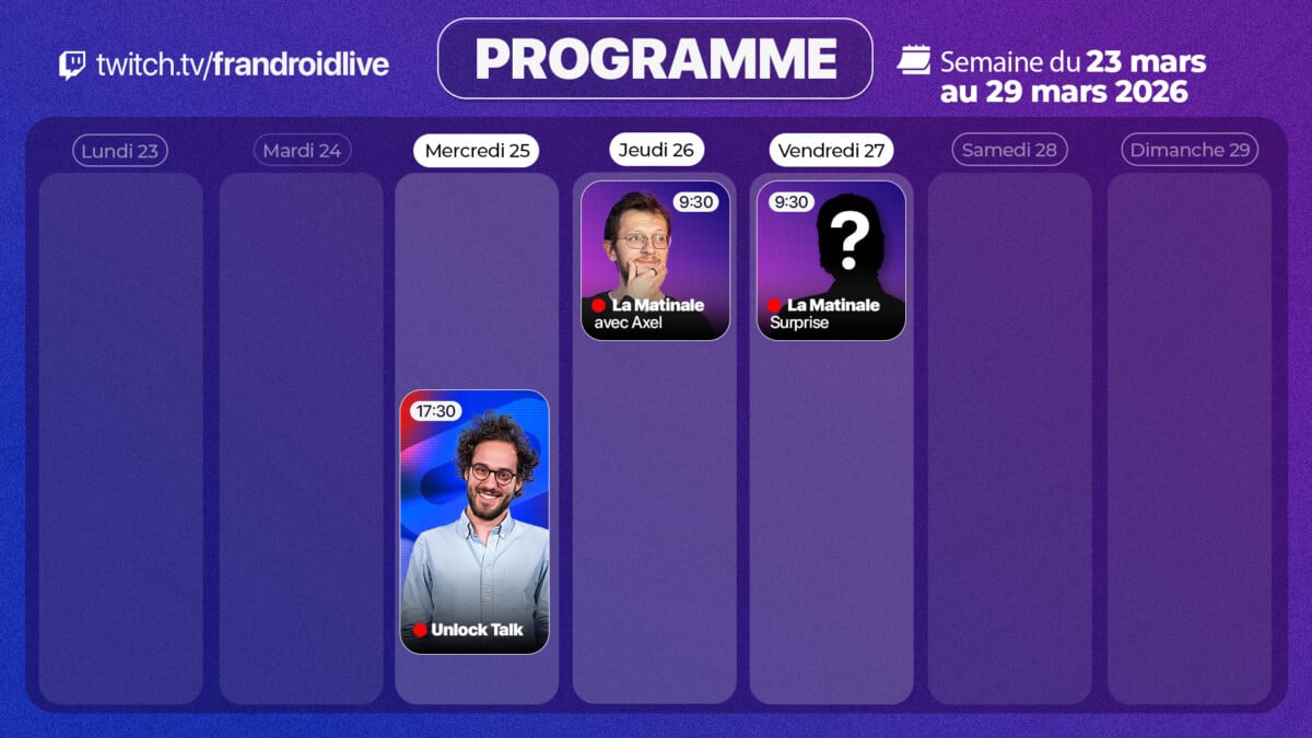 Voici le programme Twitch pour la semaine du lundi 23 mars 2026 : nous vous donnons rendez-vous, mercredi, jeudi et vendredi sur notre chaîne Frandroidlive, que ce soit pour déguster votre café lors de notre Matinale Tech’ ou pour profiter de la 46e édition d’Unlock Talk.