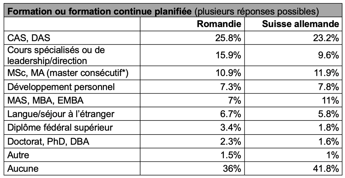 Les participants à l’étude ont également été sondés sur leurs projets de formation ou de formation continue à court terme. L’intérêt pour la formation continue demeure élevé. Les formats courts tels que les CAS et DAS sont clairement privilégiés. Les cours spécialisés ou de direction sont également très demandés en Suisse romande. Cette année, un grand nombre d’entre eux envisagent un master consécutif*. Dans l’ensemble, l’intérêt pour la formation continue est plus marqué en Suisse romande qu’en Suisse alémanique. De plus, il est notable que les femmes montrent un intérêt plus fort pour la formation continue que les hommes.